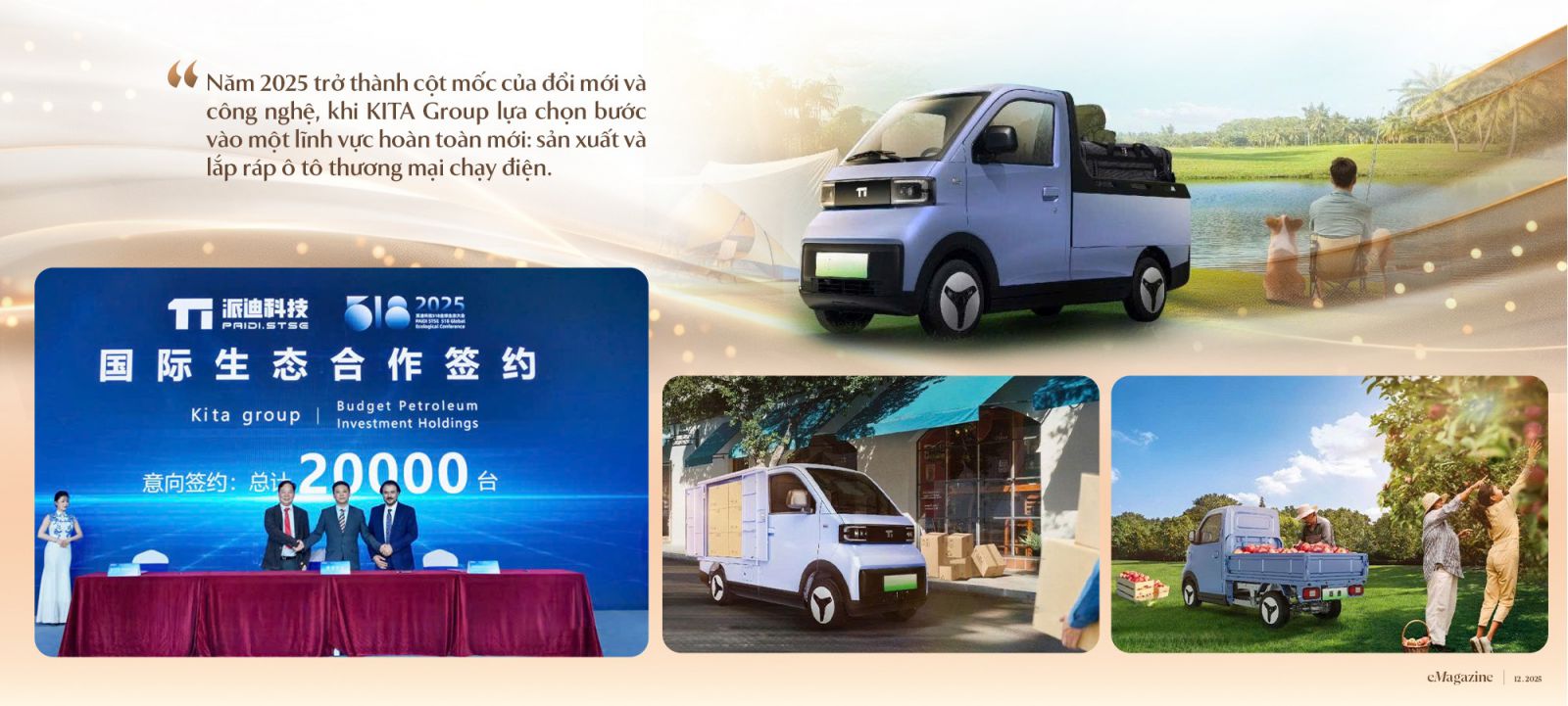 Tháng 05/2025, KITA Group chính thức ký kết hợp tác chiến lược với Chery - Tập đoàn ô tô hàng đầu Trung Quốc nhằm phát triển dòng xe tải và xe van điện mini Paidi. Những mẫu xe thương mại chạy điện đầu tiên dự kiến ra mắt vào năm 2026, mở đường cho một hệ sinh thái vận tải xanh, nơi mỗi hành trình giao nhận sẽ ít đi một phần phát thải và mỗi chuyển động trong thành phố sẽ trở nên bền vững hơn.